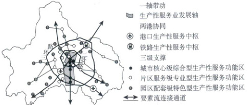 [安徽蚌埠 2025 高一期末]生产性服务业是指为保持工业生产过程的连续性、促进工业技术进步、产业升级和提高生产效率提供保障服务的服务行业。近年来,成都市结合城市功能布局和产业功能区发展布局,不断优化市域生产性服务业空间布局,形成了“一轴带动、两港协同、三级支撑”的空间布局(见下图)。据此完成下面小题。