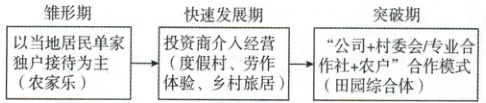 (1)本题考查服务业发展特征。读图可知,雏形期以当地居民单家独户接待为主(农家乐),以当地居民为主要参与者,通过单家独户接待,传承乡村文化,保留乡村原始景观,开发程度低;雏形期乡村旅游规模不大,以小规模的“农家乐”为主,居民初期投入资金少,经营规模小、成本低,难度小;经营形态相对单一,以餐饮和住宿为主,市场竞争力不强,经济效益不高。【特征描述类】