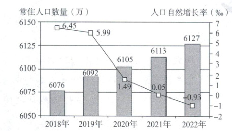 [四川眉山2025高一期末]下图为2018—2022年我国某省常住人口数量和自然增长率统计图。据此完成下面小题。