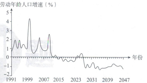 [河南信阳高级中学2024高一月考]人口机会窗口期是人口年龄结构有利于经济发展、劳动力供给充足、人口抚养负担相对较轻的一段时期。下图为我国1991—2047年劳动年龄人口增速变化图(含预测)。面对我国劳动年龄人口变化形势,较发达城市正在积极实施“积分入户”政策,“积分入户”指外来人口取得政策规定分值后即可申请落户,是迁入地促进外来人口融入的有效方式。据此完成下面小题。