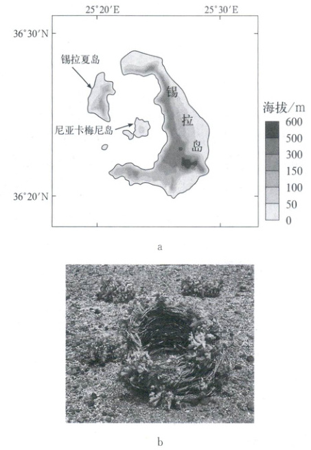 [山东 2024·11~12]锡拉岛位于地中海,整个岛屿被厚厚的火山岩和火山灰覆盖,夏季岛上北风频发。约 3600 年前的古锡拉岛是一个圆形的大岛(范围包括现在的锡拉岛和附近小岛,以及这些岛屿之间的海域),后来演变成环形群岛,其中最大的岛屿为锡拉岛(图 a)。锡拉岛的西部葡萄种植历史悠久,当地农民在管理葡萄时将葡萄藤盘成圆形的篮子状(图 b),并将葡萄果实置于“篮子”内生长。据此完成下面小题。