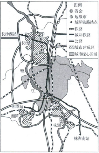 教材变式[广东六校联盟2025高一联考]长株潭城际铁路连接长沙、株洲和湘潭,设计速度200千米/小时。为避免对城市环境的影响,沿线修建多个桥隧工程穿越城镇密集地带。基于长株潭“一小时通勤圈”的建设,城际铁路建成后大幅提高开行密度,平均发车间隔为10~20分钟,基本达到“公交化”的水平。下图为长株潭城际铁路示意图。据此完成下题。