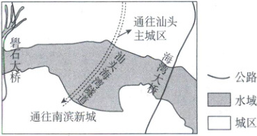 [福建泉州2025高一期中]汕头市地处广东省东部,是韩江、榕江、练江三江入海之地,常受台风侵袭。汕头市被榕江分割为南北两岸,曾经仅靠碧(què)石大桥和海湾大桥沟通两岸,通行压力较大。2022年9月,双向六车道的海湾隧道全面通车,助力汕头市构筑“一湾两岸”的城市发展格局。下图示意汕头市局部区域。据此完成下面小题。