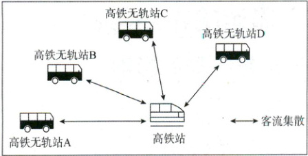 [重庆万州区2024高一期末]高铁无轨站指的是在没有高铁线路经过的城市开设的具有“购票、取票、候车”功能的专门站点,通过开通专线大巴与就近高铁站无缝相连,将客流引入高铁,让边远地区群众也能快捷出行。下图为高铁无轨站一般模式图。据此完成下面小题。