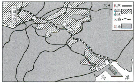 [福建福州2025模拟预测]深圳盐田港主要承担华南地区至欧美外贸集装箱运输功能,集装箱主要来自珠三角地区。1993年深圳建设平盐铁路作为集装箱运输专用单线铁路,2017年后平盐铁路海铁联运量逐年上升,但占比仍偏低,货物离港主要依靠城市道路疏解。为化解港城矛盾,深圳提出将对平盐铁路进行改造,以地下铺设为主。如图示意平盐铁路平面布局。据此完成下面小题。
