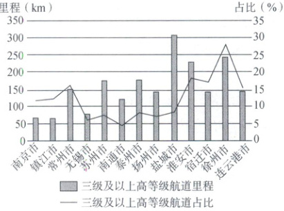 [河北邢台2025高一月考]在内河航运中,三级以上河道可通行船舶吨位较大,河运价值较高。江苏省受独特地理格局的影响,内河运输量较大,内河运输发达,但各地级市内河运输条件差异较大。下图为2020年江苏全省地级市三级及以上高等级航道情况图。据此完成下面小题。