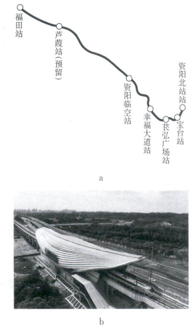 [吉林长春外国语学校2025高一期中]成都市域铁路S3线(以下简称“S3线”)是连接成都地铁18号线福田站与高铁资阳北站的一条轨道交通线。全线长约39.37千米,“地下+高架”路段占比约90%,其中地下段长约9.77千米。S3线实行地铁化运营,在福田站同站换乘,不用重新过闸机。图a为S3线路图,图b为S3线某站点景观图。据此完成下面小题。