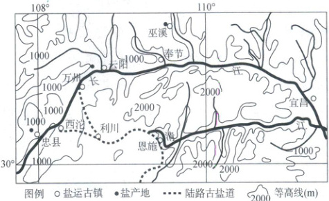 [广东茂名2025高一月考]古代川盐外运主要有两种方式,陆路运盐主要依靠肩挑马驮,水路运盐通常使用小木船。川盐的生产和外运造就了一批盐运古镇,如西沱古镇。西沱古镇为古代水路与陆路运盐的重要枢纽。下图示意我国局部区域图。据此完成下面小题。