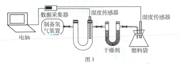 利用锌与稀硫酸反应制取氢气,连接装置(如图1)。在相同条件下分别将氯化钙、碱石灰(生石灰与氢氧化钠固体的混合物)放入U形管作干燥剂,进行实验,实验结果如图2、图3(已知:相对湿度越大,则气体湿度越大)。