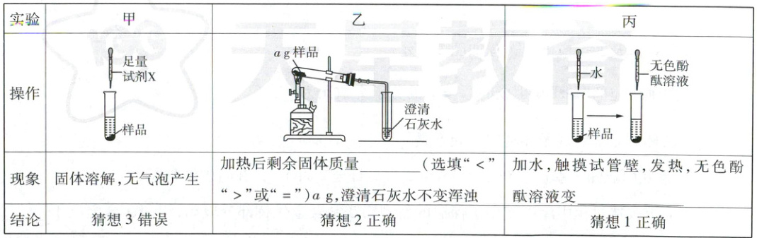 [实验拓展]澄清石灰水不变浑浊,说明样品中不含CaCO₃。假设ag样品中只含Ca(OH)₂,反应后剩余固体的质量为x,结合氢氧化钙受热分解产物都是氧化物可得: