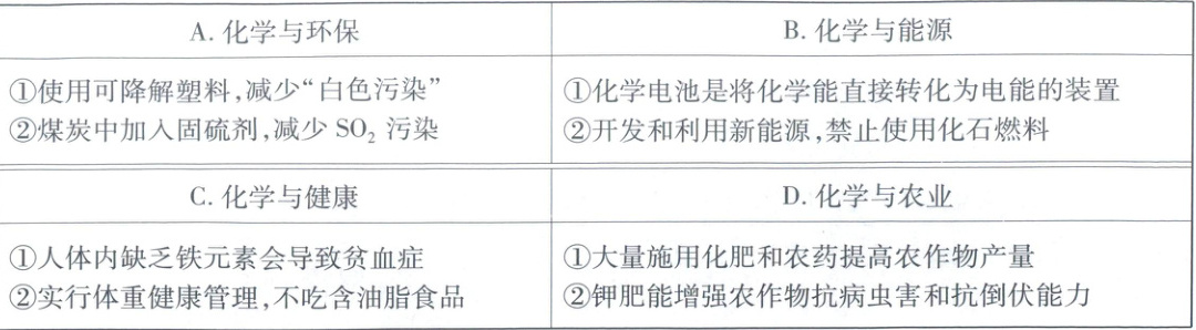 8. 2025年全国两会聚焦环保、能源、健康、农业等领域的可持续发展,化学在其中作出了重要贡献。下列各组对相关主题知识归纳完全正确的是(