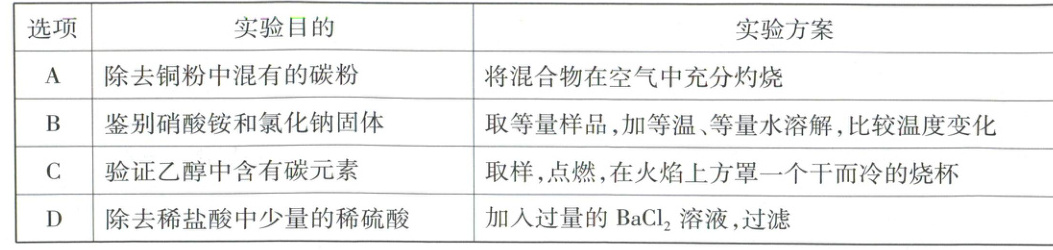 A(×)铜粉和碳粉的混合物在空气中灼烧,碳粉燃烧生成CO₂,铜会和氧气反应生成CuO,无法得到铜粉。