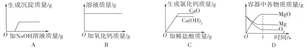 C √ 向等质量的CaO、Ca(OH)₂中分别滴加相同溶质质量分数的稀盐酸至过量,发生反应:CaO + 2HCl ══ CaCl₂ + H₂O、Ca(OH)₂ + 2HCl ══ CaCl₂ + 2H₂O,由化学方程式可知,2HCl ~ CaCl₂,即CaO、Ca(OH)₂足量时,等质量的稀盐酸产生CaCl₂的质量相同;由化学方程式可知,CaO和HCl反应的质量比为56:73,Ca(OH)₂和HCl反应的质量比为74:73,即等质量的CaO、Ca(OH)₂中分别滴加足量相同溶质质量分数的稀盐酸时,CaO消耗的稀盐酸质量大,则CaO反应生成CaCl₂的质量大