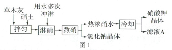 18. (10分)黑火药是我国古代的四大发明之一,其成分含有${KNO_{3}}$。古代以硝土和草木灰(主要成分${K_{2}CO_{3}}$)为原料生产${KNO_{3}}$的部分流程如图1所示。