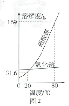 (2)80℃时KNO₃的溶解度是169 g,269 g饱和溶液中含KNO₃ 169 g、水100 g;20℃时KNO₃的溶解度是31.6 g,则降温后析出晶体质量为169 g - 31.6 g = 137.4 g。