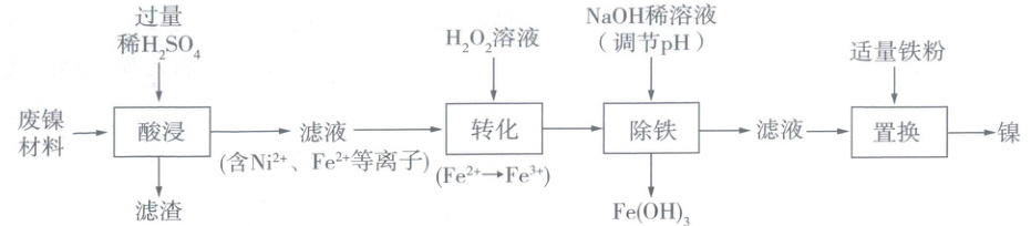 (1)根据流程图,“酸浸”后产生了Ni²⁺,则Ni与稀硫酸反应生成硫酸镍(NiSO₄)和氢气,化学方程式为Ni + H₂SO₄ ══ NiSO₄ + H₂↑;该反应是一种单质和一种化合物反应生成另一种单质和另一种化合物,基本反应类型是置换反应。废镍材料中Cu在金属活动顺序中位于H之后,不与稀硫酸反应,铁和稀硫酸反应生成硫酸亚铁和氢气,氧化铁和稀硫酸反应生成硫酸铁和水,所以“酸浸”后滤渣成分是Cu。