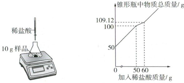 (2)解:与碳酸钙反应的稀盐酸质量是60 g - 50 g = 10 g。设所加入的稀盐酸的溶质质量分数是x。CaCO₃ + 2HCl ══ CaCl₂ + H₂O + CO₂↑73 4410 g × x 0.88 g$\frac{73}{44} = \frac{10 g × x}{0.88 g}$x = 14.6%答:稀盐酸的溶质质量分数是14.6%。