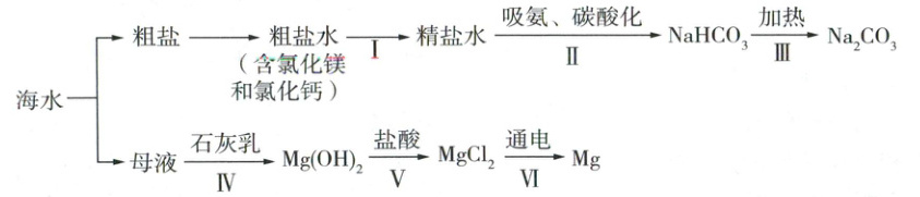 C(×)流程Ⅰ中发生的反应是氯化镁与氢氧化钙反应生成氢氧化镁和氯化钙,氯化钙与碳酸钠反应生成氯化钠和碳酸钙,碳酸钠与氢氧化钙反应生成碳酸钙和氢氧化钠,盐酸与碳酸钠反应生成氯化钠、水和二氧化碳,氢氧化钠与盐酸反应生成氯化钠和水,都属于复分解反应;流程Ⅱ中发生的反应是$NaCl + H_2O + NH_3 + CO_2= NaHCO_3\downarrow + NH_4Cl$,即$NH_4HCO_3 + NaCl = NaHCO_3\downarrow + NH_4Cl$,属于复分解反应;流程Ⅲ中发生的反应是碳酸氢钠分解为碳酸钠、水和二氧化碳,属于分解反应;流程Ⅳ是氯化镁与氢氧化钙反应生成氢氧化镁和氯化钙,属于复分解反应;流程Ⅴ是氢氧化镁与盐酸反应生成氯化镁和水,属于复分解反应;流程Ⅵ是氯化镁通电分解生成镁和氯气,属于分解反应。上述流程涉及几种基本反应类型。