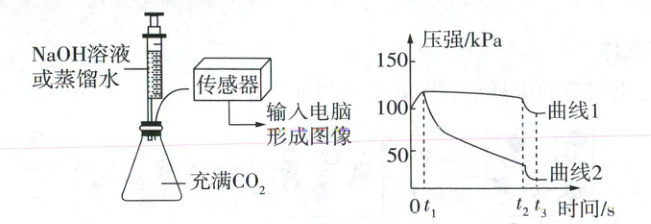 D.对比曲线1和曲线2,可说明NaOH溶液吸收CO₂的效果比蒸馏水吸收CO₂的效果好