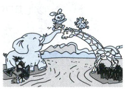 图上有哪些小动物?它们在什么地方?遇到什么事?会说些什么?它们想出了什么办法?仔细看图,展开想象,写一段通顺连贯的话。
