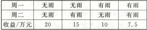 (1)设下周一无雨的概率为 $p$,由题意,得 $p^2=0.36$,解得 $p=0.6$(负值已舍去),该基地收益 $X$ 的可能取值为 20,15,10,7.5,则 $P(X=20)=0.36,P(X=15)=0.24,P(X=10)=0.24$,$P(X=7.5)=0.16$,所以该基地收益 $X$ 的分布列为