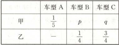 17. (15分)甲、乙两人为了响应政府“节能减排”的号召,决定各购置一辆纯电动汽车.经了解,目前市场上销售的主流纯电动汽车,按行驶里程数$R$(单位:千米)可分为三类车型,分别是A:$80 \leq R < 150$;B:$150 \leq R < 250$;C:$R \geq 250$.甲从A、B、C三类车型中挑选,乙从B、C两类车型中挑选,甲、乙二人选择各类车型的概率如下表: