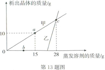13. B(2025·广安)20℃时,将一定质量的甲、乙两种溶液进行恒温蒸发,蒸发溶剂的质量与析出晶体的质量关系如图所示(图中两线相交于 c 点)。下列分析错误的是(