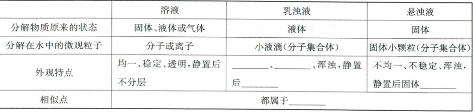 说明:(1)均一性是指溶液各部分的组成、性质完全相同。稳定性是指在温度、压强等外部因素不变化的情况下,溶液不会出现分层、沉淀等现象。