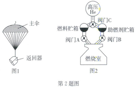 (3)长征系列运载火箭的第一、二子级火箭多数采用偏二甲肼(C₂H₈N₂)和四氧化二氮(N₂O₄)作为燃料和助燃剂,在点火时反应生成氮气、二氧化碳和另外一种氧化物,该反应的化学方程式为_。火箭发动机运行简示图如图 2 所示,燃料和助燃剂需要高压氦气推动,经阀门 A、B 后形成高压气态混合物再点燃,目的是_。