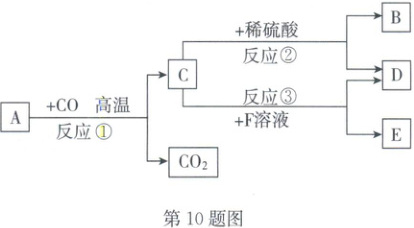 10. A 现有A~F六种物质,已知A是赤铁矿的主要成分,F溶液为蓝色,它们之间存在如图所示的转化关系。