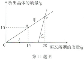 11. (2025·广安)20℃时,将一定质量的甲、乙两种溶液进行恒温蒸发,蒸发溶剂的质量与析出晶体的质量关系如图所示(图中两线相交于 c 点)。下列分析错误的是(