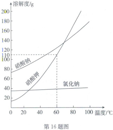 16. (2025·重庆)硝酸钠、硝酸钾、氯化钠三种物质的溶解度曲线如图所示。