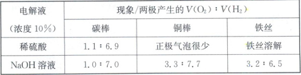 步骤 3:使用不同材质电极和电解液进行实验,探究不同材质电极和电解液对实验结果的影响。现象和两极产生的 V(O₂):V(H₂)情况如表。