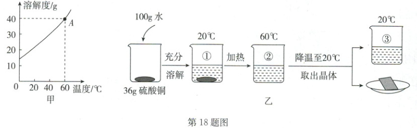 18. (2025·河北)感探究之趣,赏化学之美——制作美丽硫酸铜晶体。图甲所示为硫酸铜的溶解度曲线,图乙所示为制作硫酸铜晶体的实验过程(不考虑水的蒸发)。