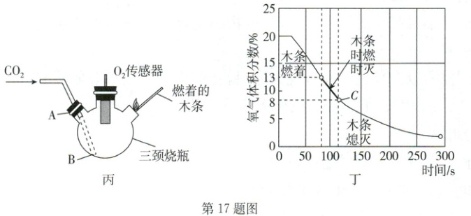 (填“A”或“B”)位置。②图丁所示C点处燃着的木条熄灭,此时三颈烧瓶内CO₂的体积分数约为
