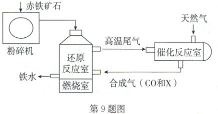 9. (2025·吉林)竖炉炼铁的工艺流程如图所示。催化反应室中发生的反应之一为 CH₄ + CO₂ $\xlongequal[高温]{催化剂}$ 2CO + 2X。下列分析正确的是(