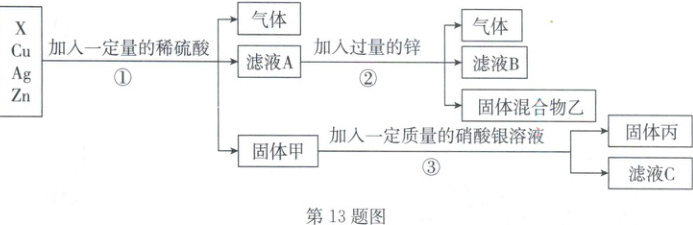 13.C 点拨:A.根据分析,反应①中锌与稀硫酸反应生成硫酸锌和氢气、X与稀硫酸反应生成X的硫酸盐与氢气,反应②中锌与稀硫酸反应生成硫酸锌与氢气,该选项说法正确;B.根据分析,乙中有锌和X,则在反应①中X能与稀硫酸反应生成X的硫酸盐,在反应②中锌能置换出X的硫酸盐中的X,说明锌比X活泼,则在金属活动性顺序里,锌和X排在氢前面,铜和银排在氢后面,反应③中铜能与硝酸银发生反应,说明铜的金属活动性比银强,故四种金属的活动性由强到弱的顺序是锌>X>铜>银,该选项说法正确;C.根据分析,滤液A中含有硫酸锌、硫酸、X的硫酸盐三种溶质,该选项说法错误;D.由金属活动性(氢)>铜>银可知,固体甲为铜、银,向固体甲中加入一定质量的硝酸银溶液,铜与硝酸银反应生成银和硝酸铜,因此固体丙中一定有银,该选项说法正确。