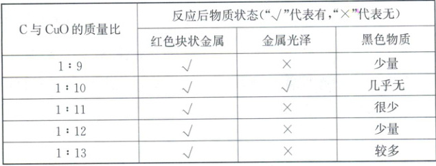 ②为获得最佳实验效果,控制 C 与 CuO 的总质量一定,按不同质量比进行实验所得反应后物质状态如表,由实验知 C 和 CuO 质量比为 1:10 时实验效果最佳,判断依据是