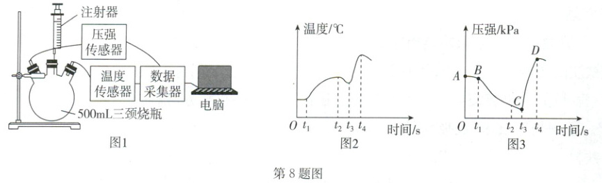 8.D 点拨:t₃~t₄时刻压强突然变大,是因为盐酸和铁反应生成大量氢气,故反应的化学方程式为Fe + 2HCl = FeCl₂ + H₂↑。
