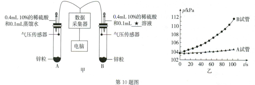 10. C 为探究硫酸铜溶液对锌和稀硫酸反应速率的影响,学习小组利用图甲装置和试剂进行实验。试管中挤入溶液后,立即开启数据采集器,测得100s内气压p与时间t的关系如图乙。下列说法不正确的是(