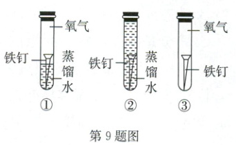9.A 点拨:实验①是铁在氧气和水共同作用下的反应,实验②是铁只与水接触的反应,实验③是铁只与氧气接触的反应。要想证明铁生锈时,氧气一定参加了反应,就要进行铁在氧气和水共同作用下的反应实验和铁在只有水没有氧气下的实验,即控制变量氧气,其他量相同,所以选①②。