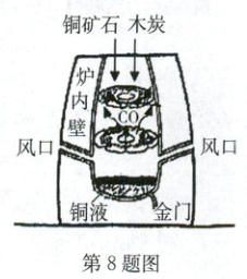 8. B (2025·苏州新区一模)竖炉炼铜技术可追溯到春秋时期,其装置如图所示。炼铜时将铜矿石粉和木炭粉从上方投入,鼓入充足的空气,使木炭燃烧产生1200℃以上高温,生成的铜液从金门流出。下列说法不正确的是(
