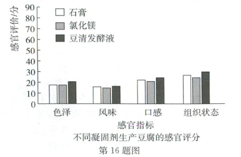 。点浆时,石膏、氯化镁和豆清发酵液三种凝固剂生产豆腐的感官评分如图所示,综合考虑最适宜作凝固剂的是豆清发酵液