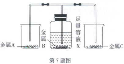 7. (2025·云南)云南斑铜“妙在有斑,贵在浑厚”,其制作技艺是国家级非物质文化遗产。斑铜主要含有铜、锌、锡、铁等。用如图所示装置及试剂,通过一次实验验证锌、铁、铜的金属活动性,回答下列问题。
