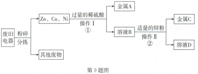 9. (2025·芜湖一模)垃圾是放错地方的资源,城市的废旧电器是一座“金属矿山”。某废旧电器含有锌、铜、镍($Ni$)三种金属,小明同学设计从中回收金属铜和镍的流程如下: