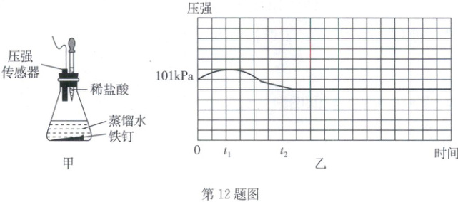 12. (2024·瑶海区校级模拟)兴趣小组设计图甲装置探究铁钉锈蚀过程中气态物质的变化,恒温下,向锥形瓶中加入少量稀盐酸,同时测量锥形瓶内气体压强随时间的变化,直至反应完全,变化曲线如图乙,下列有关说法错误的是(