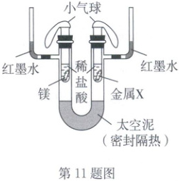 如图所示为探究镁和 $X$ 金属活动性强弱、金属与酸反应吸放热情况的实验。