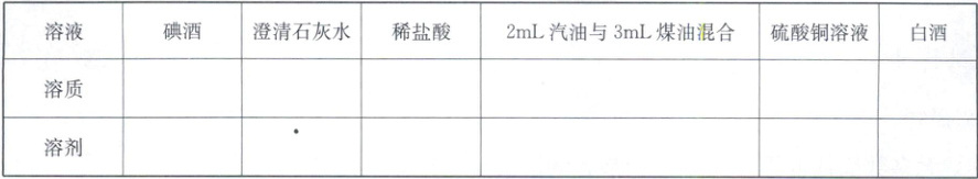 溶液 碘酒 澄清石灰水 稀盐酸 2mL汽油与3mL煤油混合 硫酸铜溶液 白酒