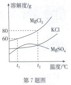 (填化学式)。③将 t₂°C 时 MgCl₂、KCl 和 MgSO₄ 三种物质的饱和溶液继续升温至一定温度,会逐渐析出