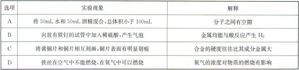 6. B (2024·沅江模拟)下列对实验现象的解释不正确的是(